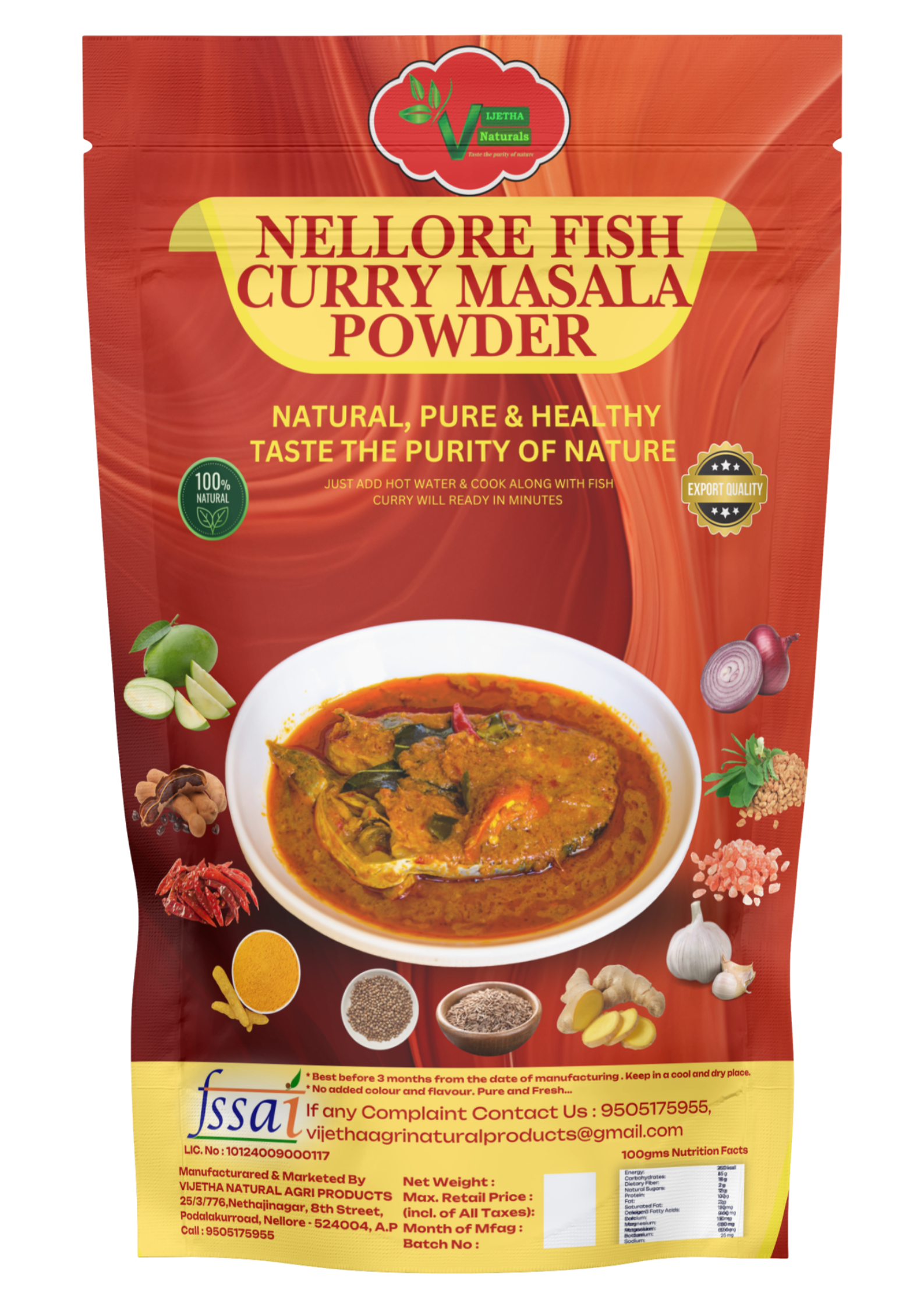 Nellore Chepala Pulusu Masala Powder is a special spice mix crafted to bring the authentic Andhra coastal taste to your kitchen. Made with a blend of roasted spices and natural ingredients, this masala enhances the rich flavor, tangy taste, and aroma of traditional fish curry. Just add it to your recipe for a mouth-watering, homestyle Nellore Chepala Pulusu experience. No preservatives, no artificial flavors – only pure taste from our kitchen to yours.