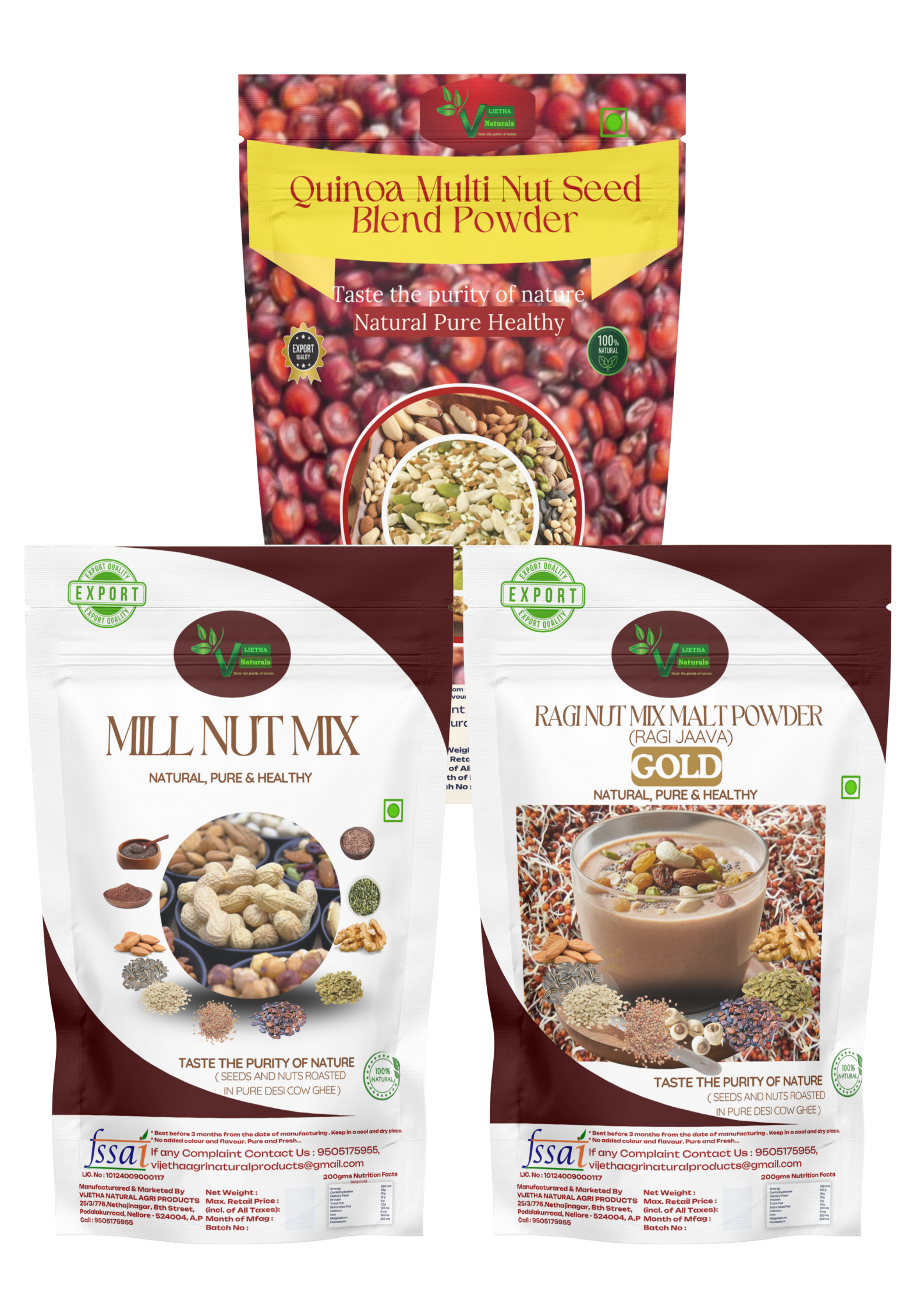 Ragi Nut Mix Malt Powder (Ragi Java) Gold 500g + Quinoa Multi Nut Seed Blend Powder 500g + Mill Nut Mix 500g